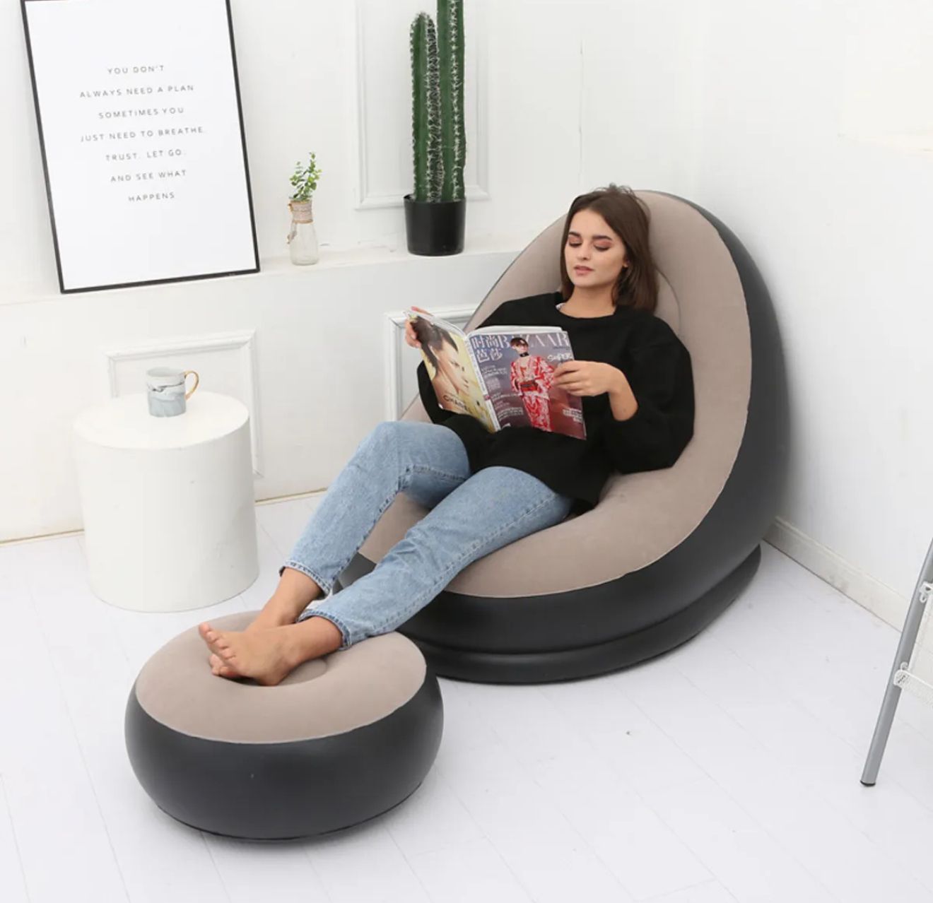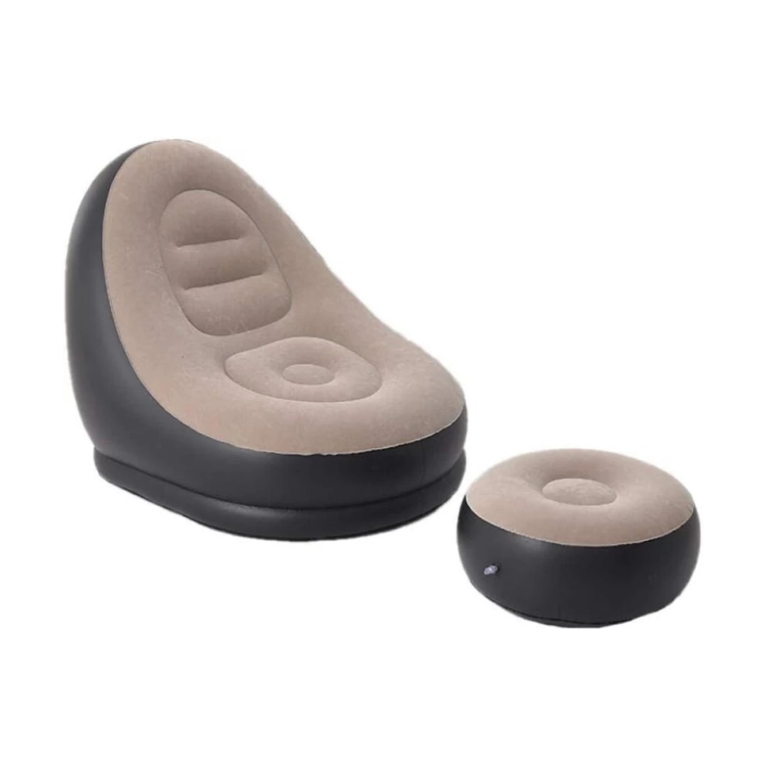 About this item 【Multifunctional Blow Up Foldable Chair】 Ideal inflatable air sofa chair for indoor and outdoor. You could rest on it at many places such as living room, bedroom, balcony, garden, outdoor yard, camping. 【Premium Material Lounger Chair】This air sofa inflatable couch is made of high quality flock on the top surface and thick PVC material on the bottom, 100% safe and eco-friendly, more durable to use and not easy to get punctured. 【Ergonomic Design Chaise Lounge】The design is ergonomic and supports your body at the most comfortable angle. It is most suitable for leisure, gaming, nap, sleeping, reading, tanning, even you can enjoy outdoor movie in yard. 【Multifunctional Ottoman】You can use it to support your legs while you are lying down. It also can be used as a stool to sit on, andeven be used as a table to place light objects such as mobile phones and magazines.